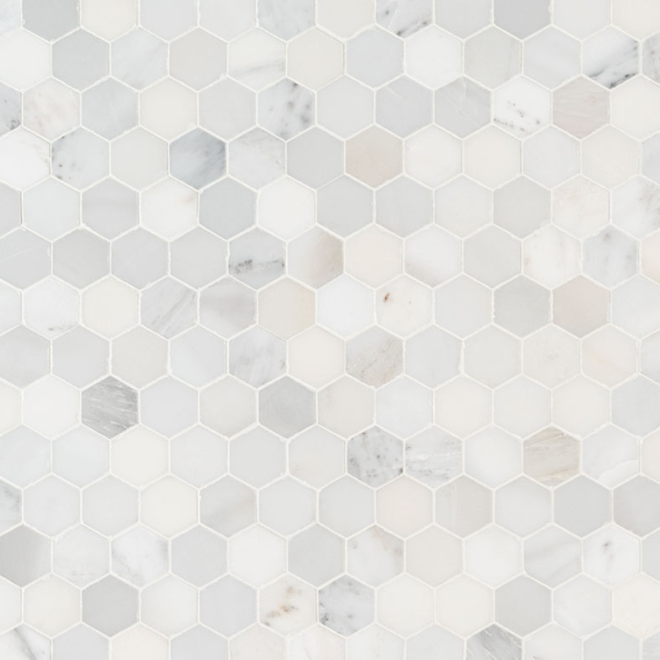 Infuse your space with the natural beauty and sophistication of Arabescato Carrara marble. Featuring a striking blend of soft white and subtle grey veining, these hexagon mosaics create a harmonious balance of modern geometry and classic luxury.