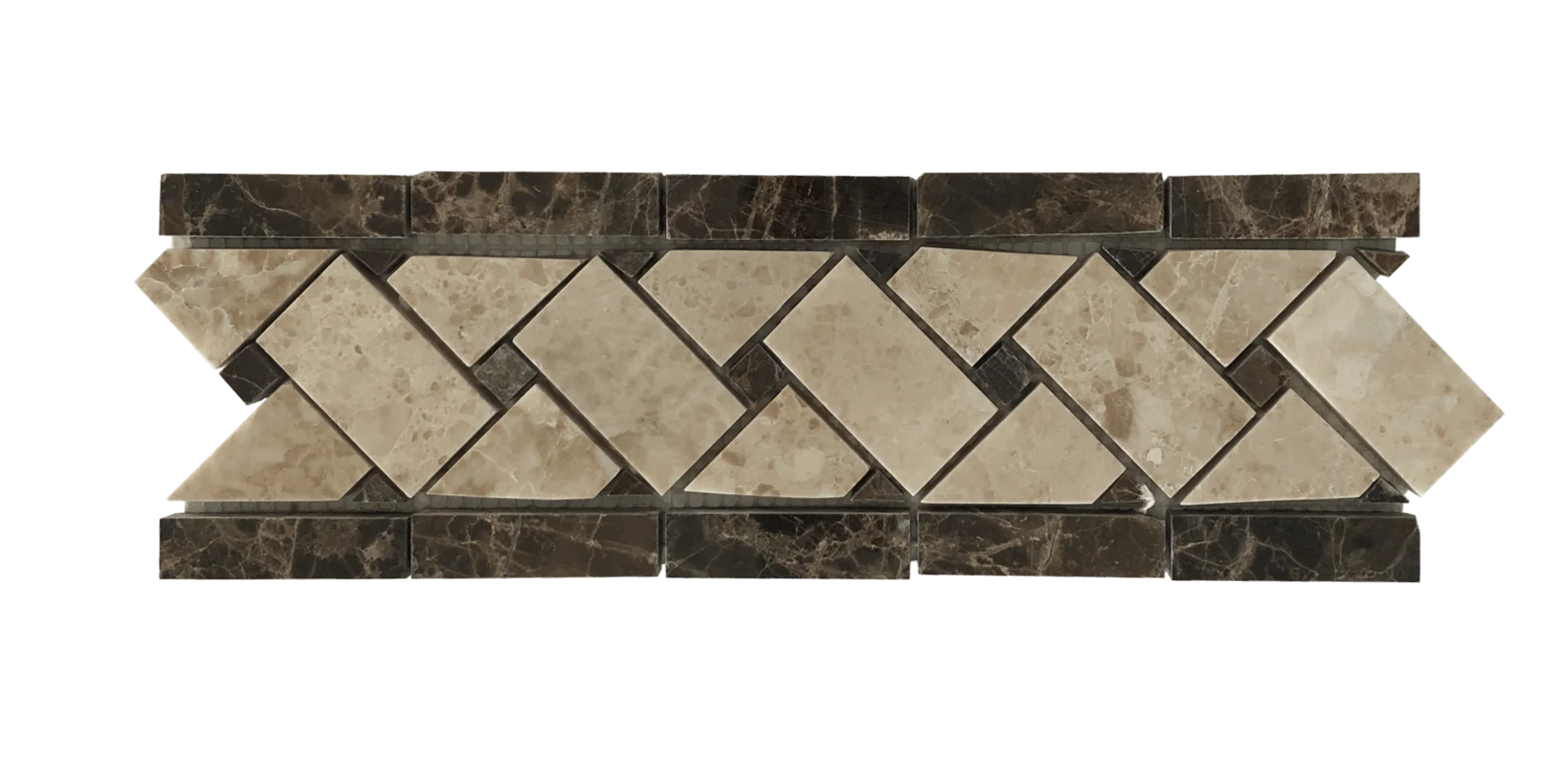 Add a warm, sophisticated accent to your design with the Cappuccino & Dark Emperador Marble Basketweave Border. Measuring 4"x12", this border blends the warmer tones of Cappuccino marble with the Dark Emperador marble, creating a subtle yet elegant contrast.