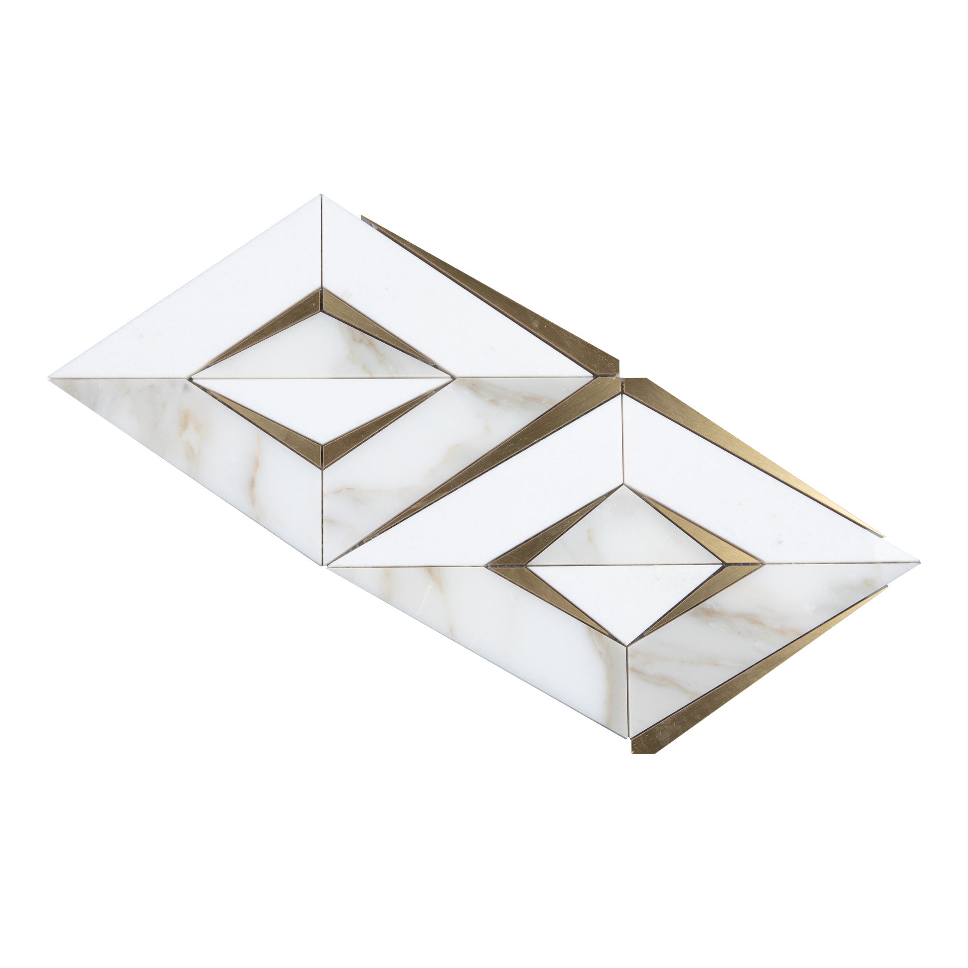 Diamond Waterjet Mosaic create a striking visual contrast between the warm tones of brass and the cool, sophisticated hues of Calacatta and Thassos marbles. The waterjet cutting technique ensures that the mosaic can feature intricate geometric or artistic designs, enhancing its aesthetic appeal and making it a focal point in any space, whether it's used for flooring, wall cladding, or decorative purposes.