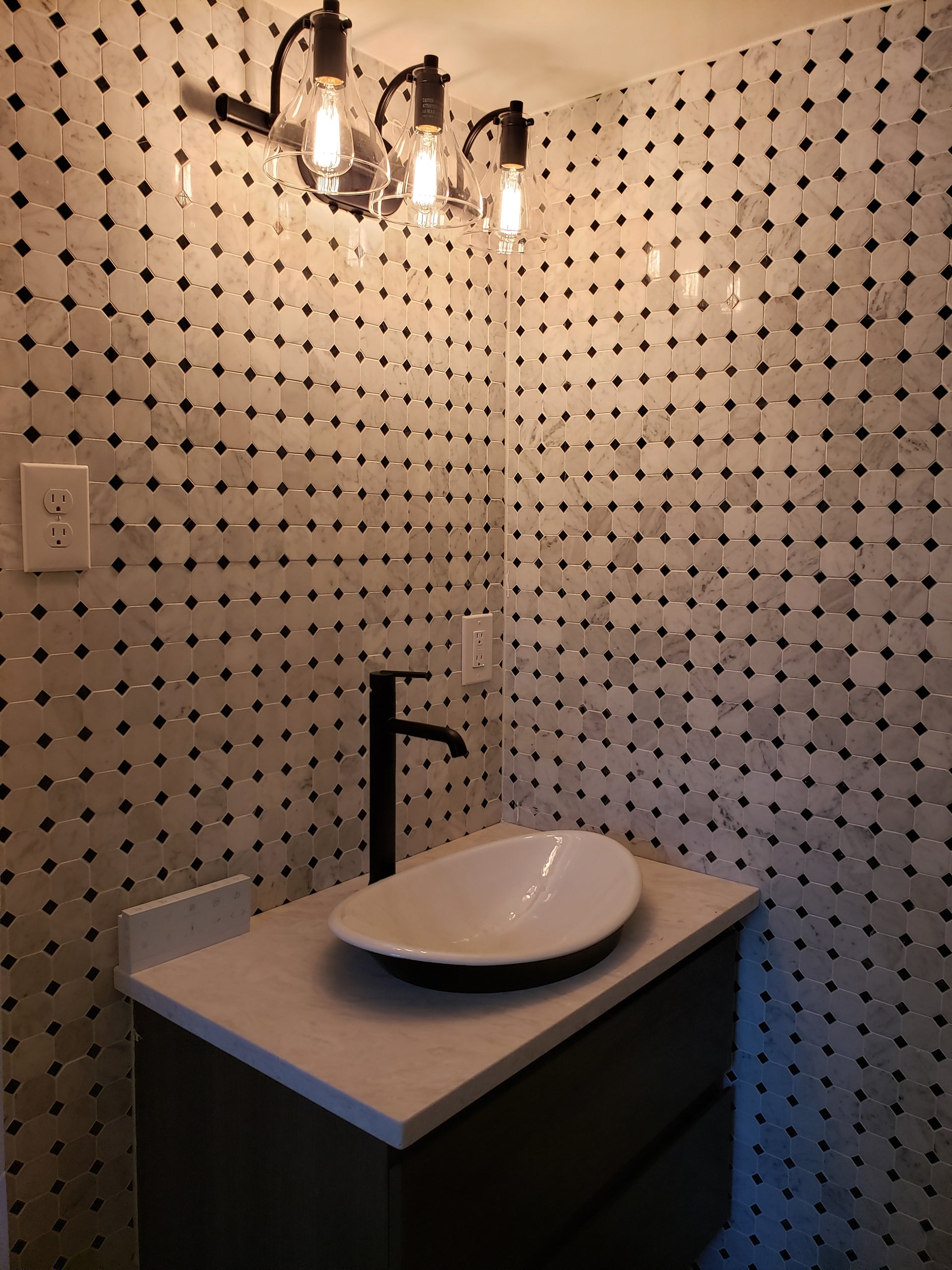 Waterjet Pattern that can't be ignored. Octagon Mosaics are made with Nero Marquina Marble and Carrara marble create the perfect pattern for your floor or wall tiles. This Waterjet Mosaic is perfect to use for Foyers, Bathroom and Kitchen Backsplashes and the color and quality of this mosaic is just gorgeous.